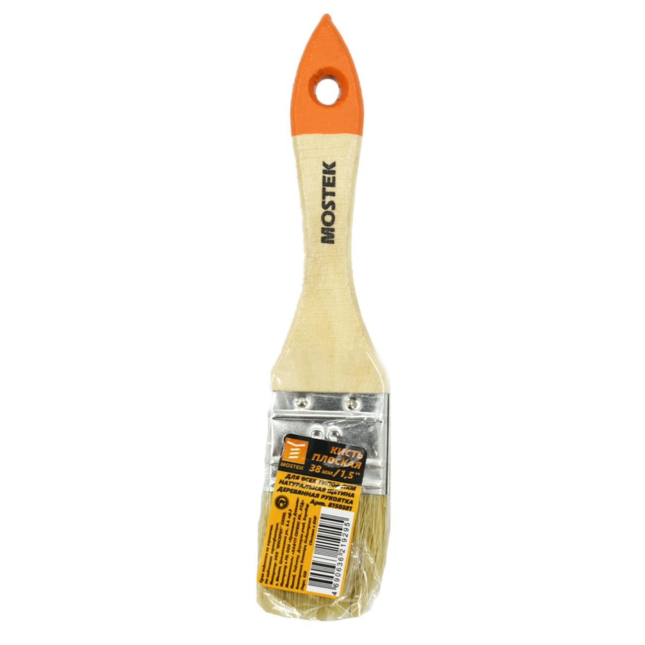 Плоская кисть с натуральной щетиной и деревянной ручкой — инструмент для проведения бытовых малярных работ. Натуральная светлая щетина обладает высокой износоустойчивостью и подходит для нанесения красок на основе растворителей. За счет ширины 38 мм кисть подходит для окрашивания узких поверхностей, например, плинтусов и рам.