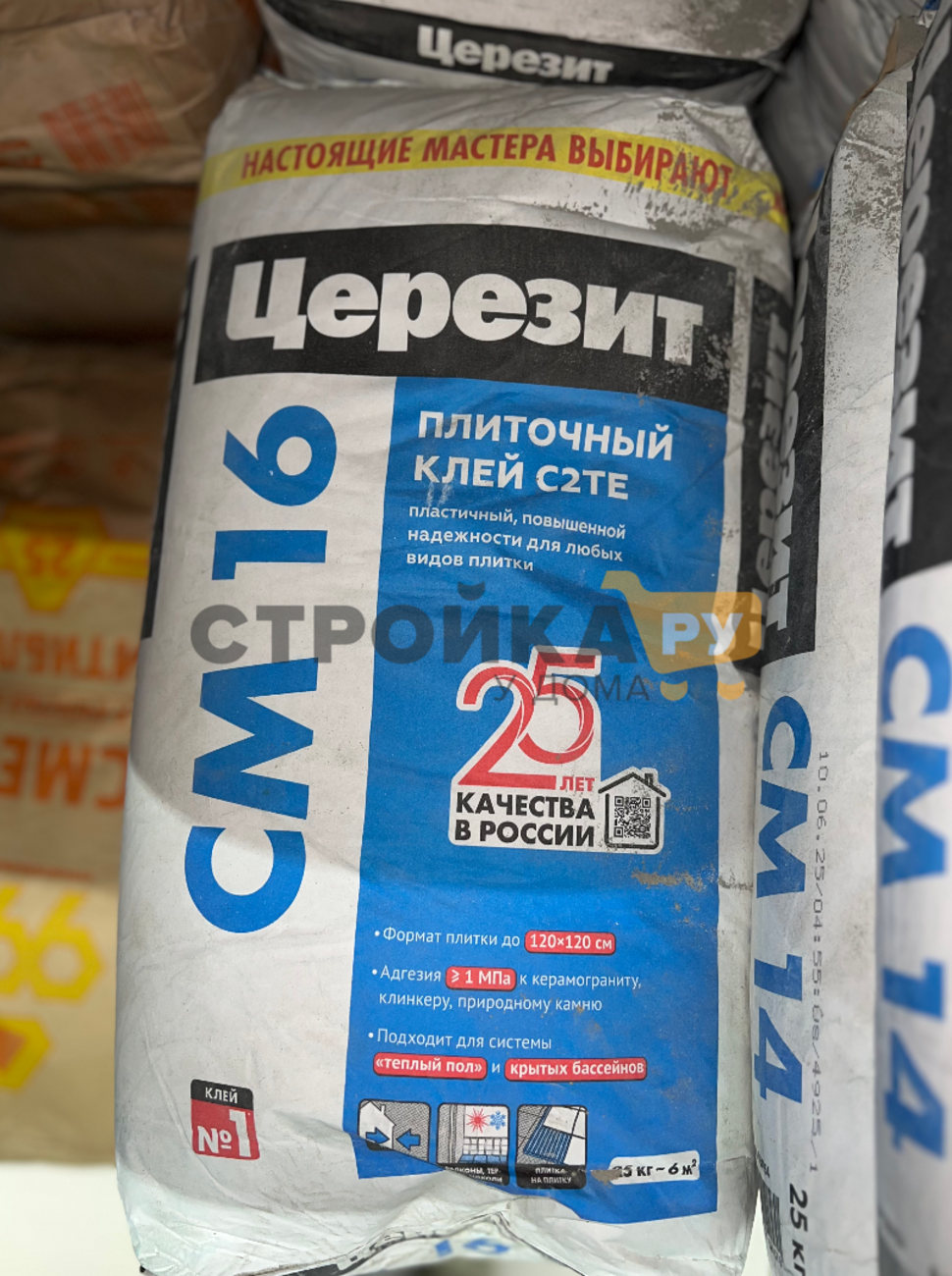 Плиточный клей цементный Церезит CM16 - это пластичный клей повышенной надежности для крепления керамических, керамогранитных, клинкерных плиток из природного камня (кроме мрамора) размером до 120×120 см.