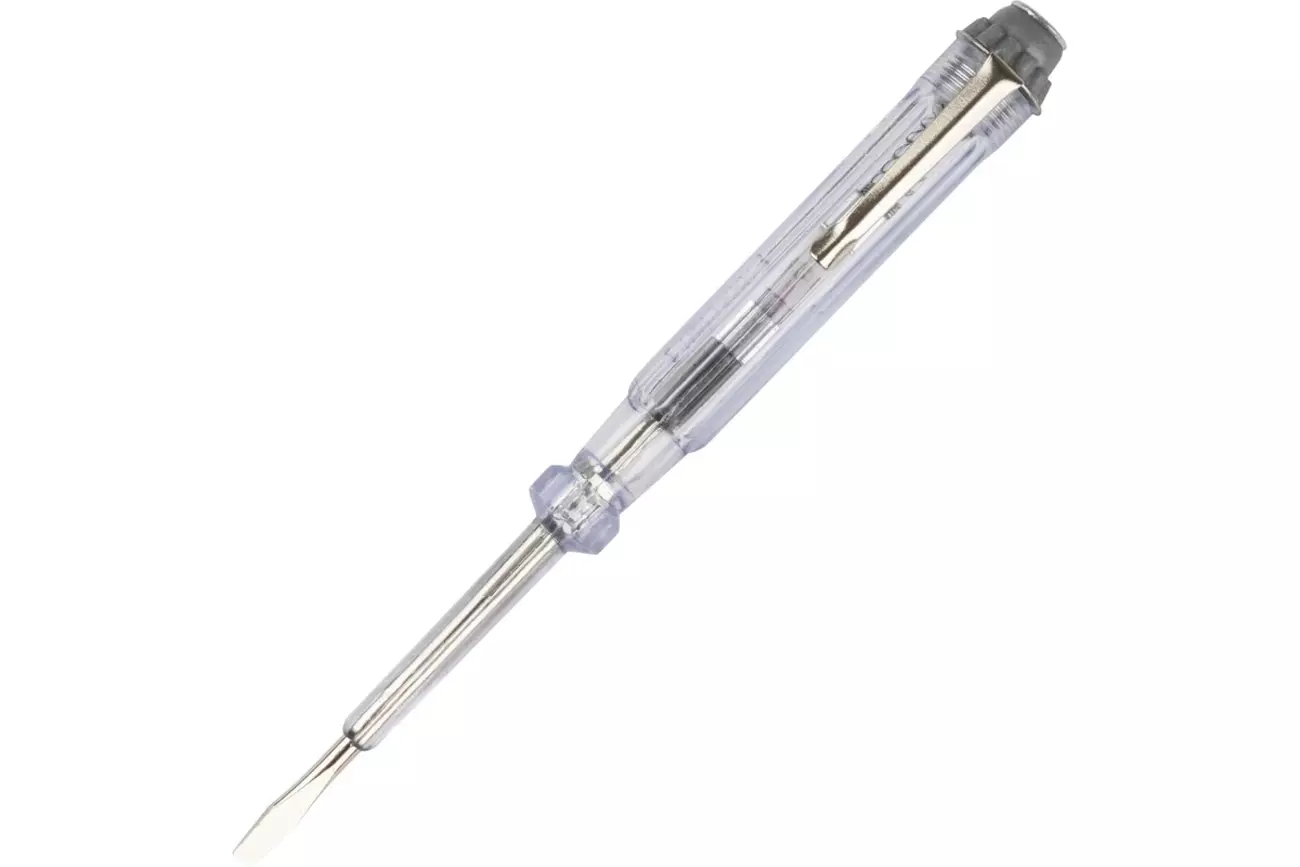 Отвертка-тестер выполнена из прочной инструментальной стали. Пластиковая прозрачная рукоять удобна для определения тока. Есть клипса для удобства переноски.