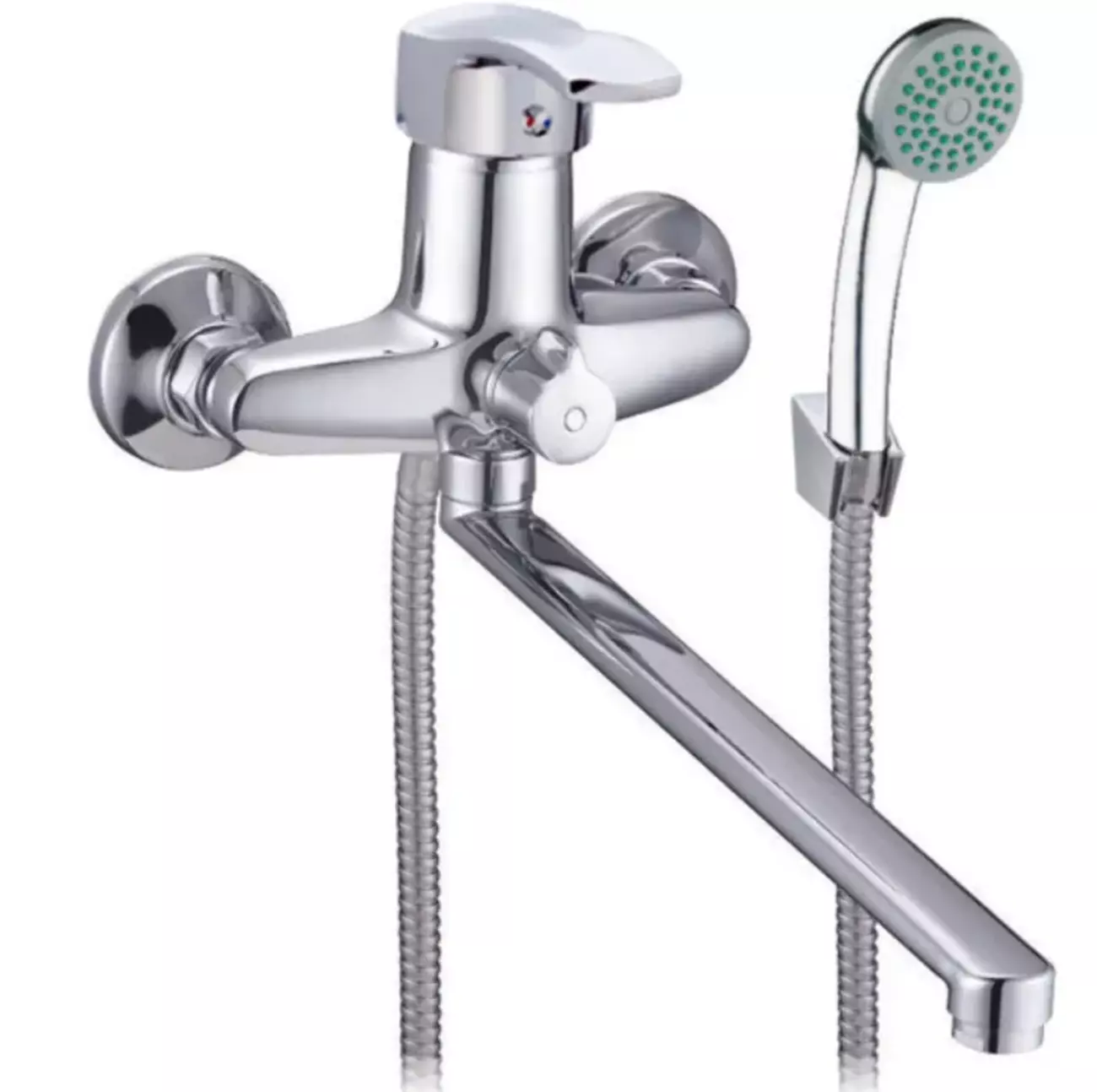 Смеситель для ванны с поворотным изливом имеет заменяемый запорный элемент - картридж с керамическими пластинами диаметром 40 мм. Устанавливается на трубы холодной и горячей воды, вмонтированные в стену. Закрепляется с помощью эксцентриков, которые идут в комплекте вместе с резиновыми прокладками, декоративными чашками, шлангом, лейкой и кронштейном.