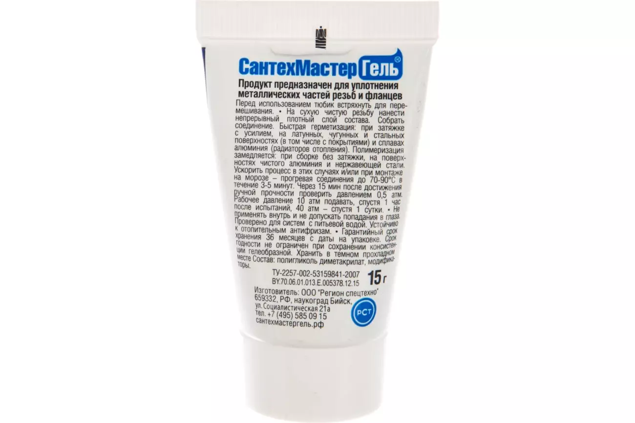 Гель СантехМастер — это резьбовой герметик для сантехники со средней степенью фиксации соединения. Данный состав рекомендован к использованию для герметизации металлических резьб, фитингов и фланцев. Используется для соединений диаметром до 2". Соединение, собранное на данный гель поддается демонтажу с использованием инструмента.