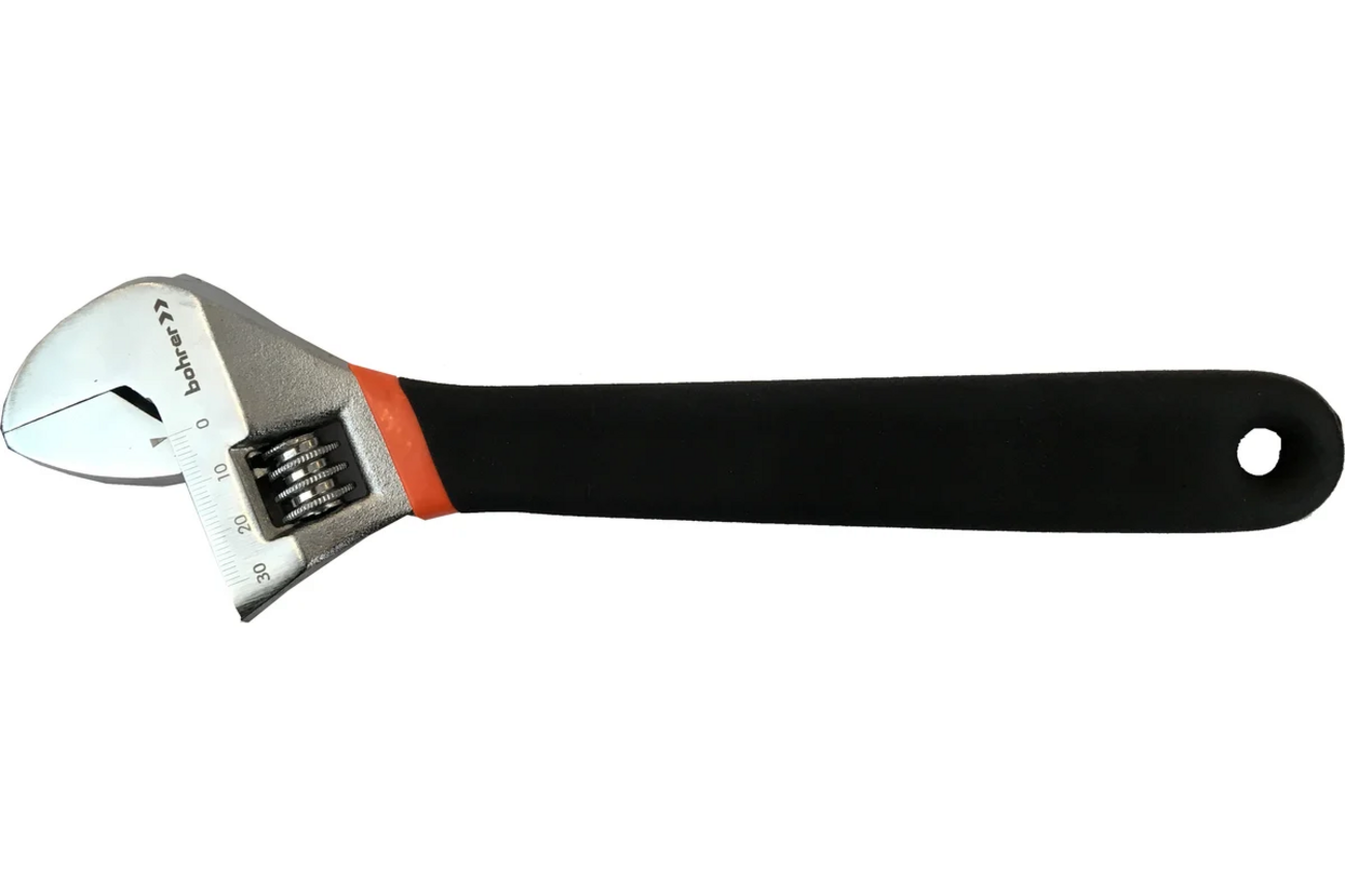 Разводной ключ представляет собой качественный ручной инструмент, предназначенный для отвинчивания и завинчивания гаек, болтов, вентилей и крепежа. Это универсальный инструмент, который может заменить несколько гаечных ключей за счет возможности регулирования раскрытия губок. Инструмент выполнен из высококачественной стали 45, что обеспечивает прочность, надежность и долгий срок службы. Двухкомпонентная прорезиненная рукоять комфортна при работе и не скользит в руках.