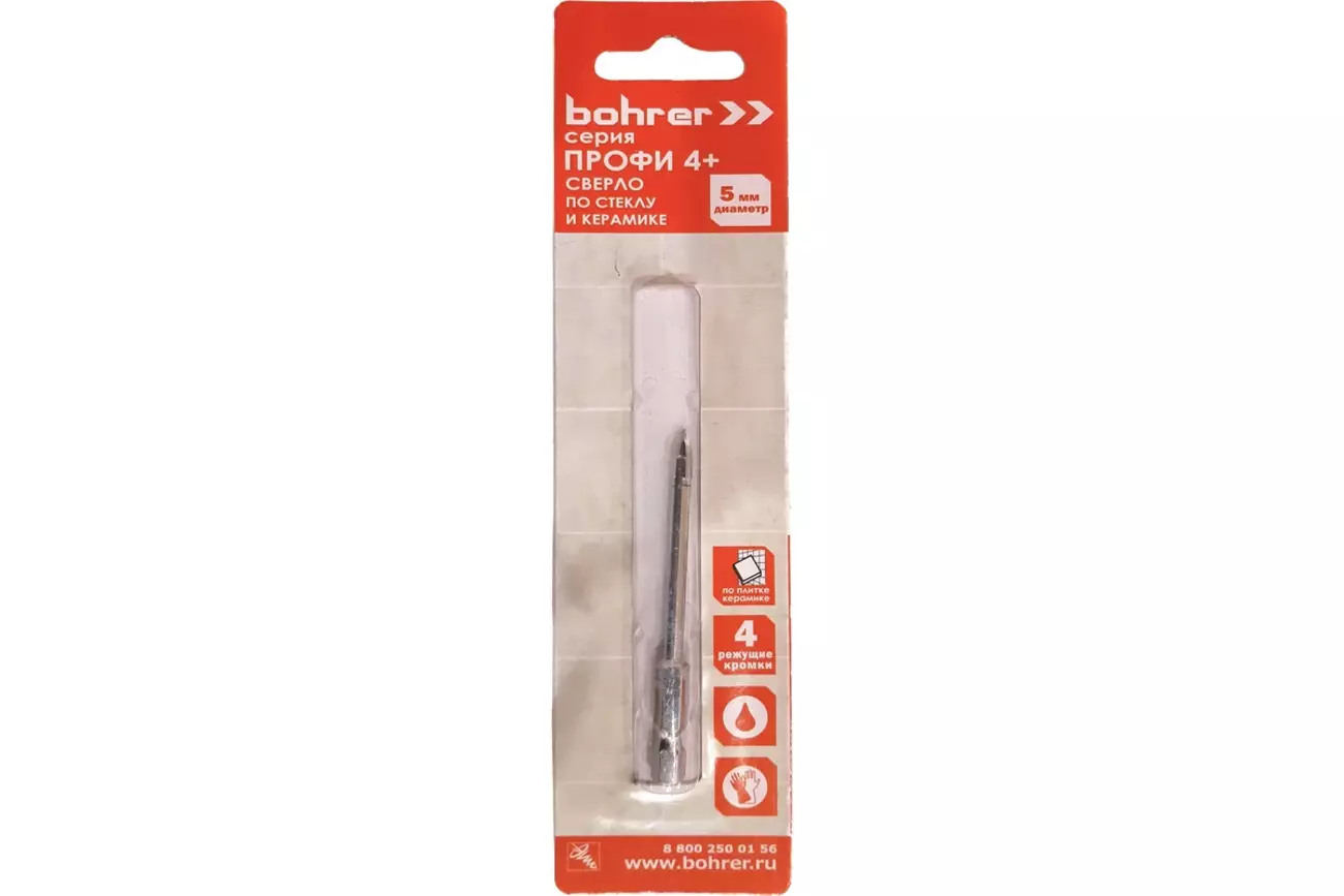 Сверло Bohrer Профи 4+ Ø 5 мм предназначено для точного сверления отверстий в хрупких и твёрдых материалах, таких как стекло, керамическая плитка и керамогранит. Копьевидная форма с четырьмя гранями обеспечивает стабильное начало сверления и минимизирует риск сколов.