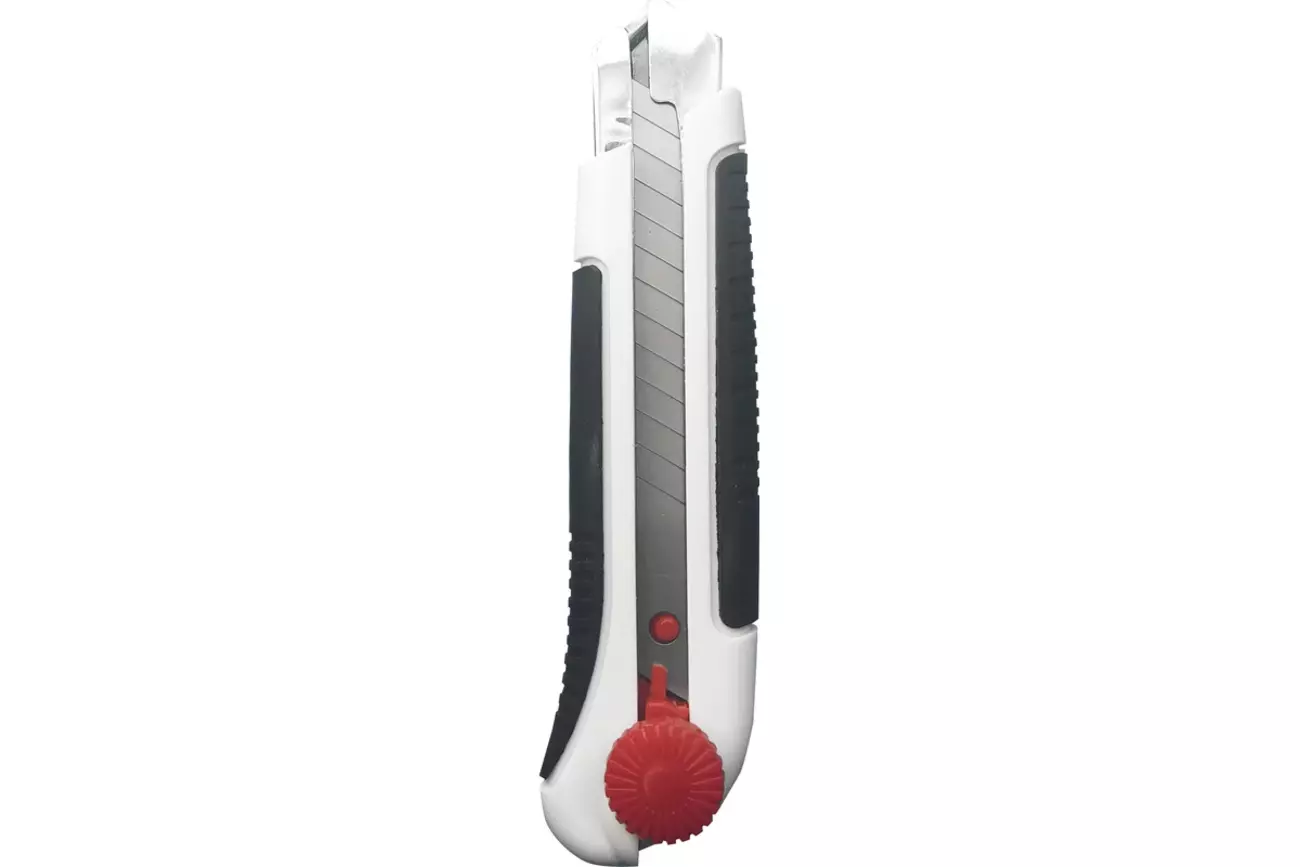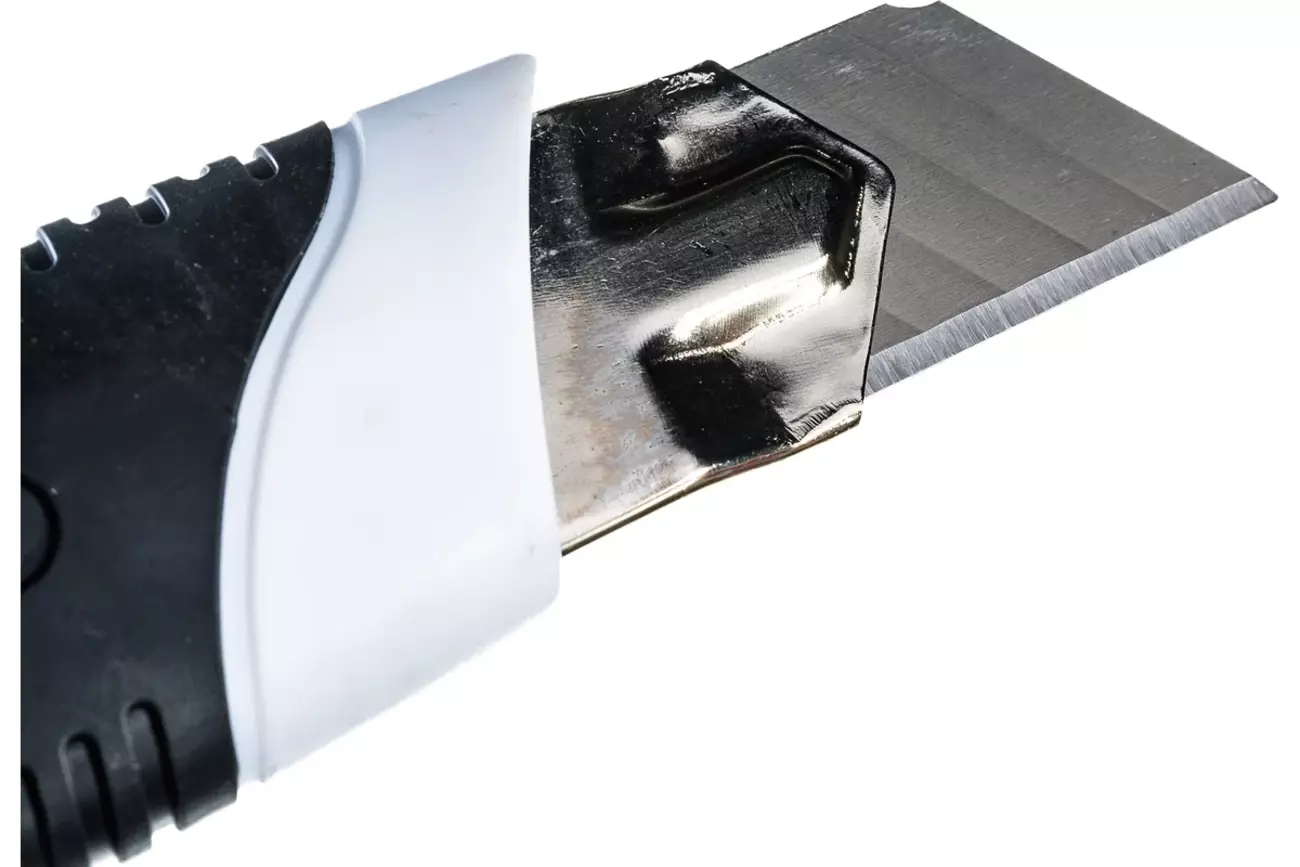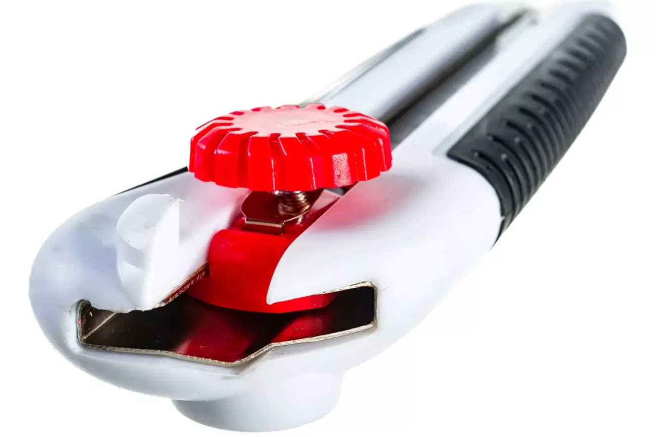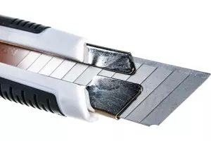 Нож универсальный Монтажник со сменными сегментированными лезвиями. Корпус обрезиненный антискользящий с винтовым фиксатором. Материал: рукоять - ударопрочный пластик ABS, лезвие - сталь.