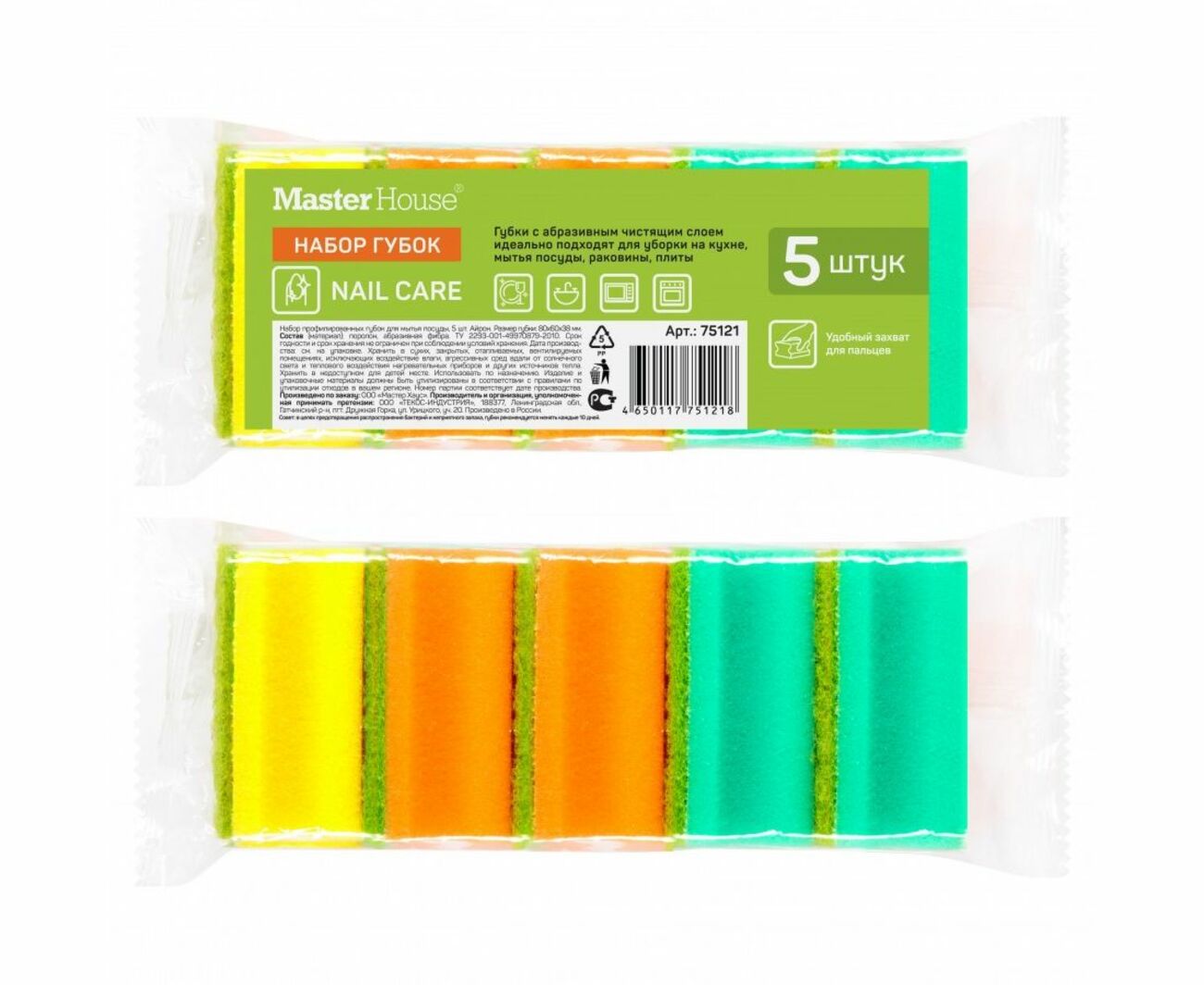 Набор профилированных губок для мытья посуды, 5 штук. Мягкий слой – для деликатного мытья, жесткий – для сильных загрязнений.