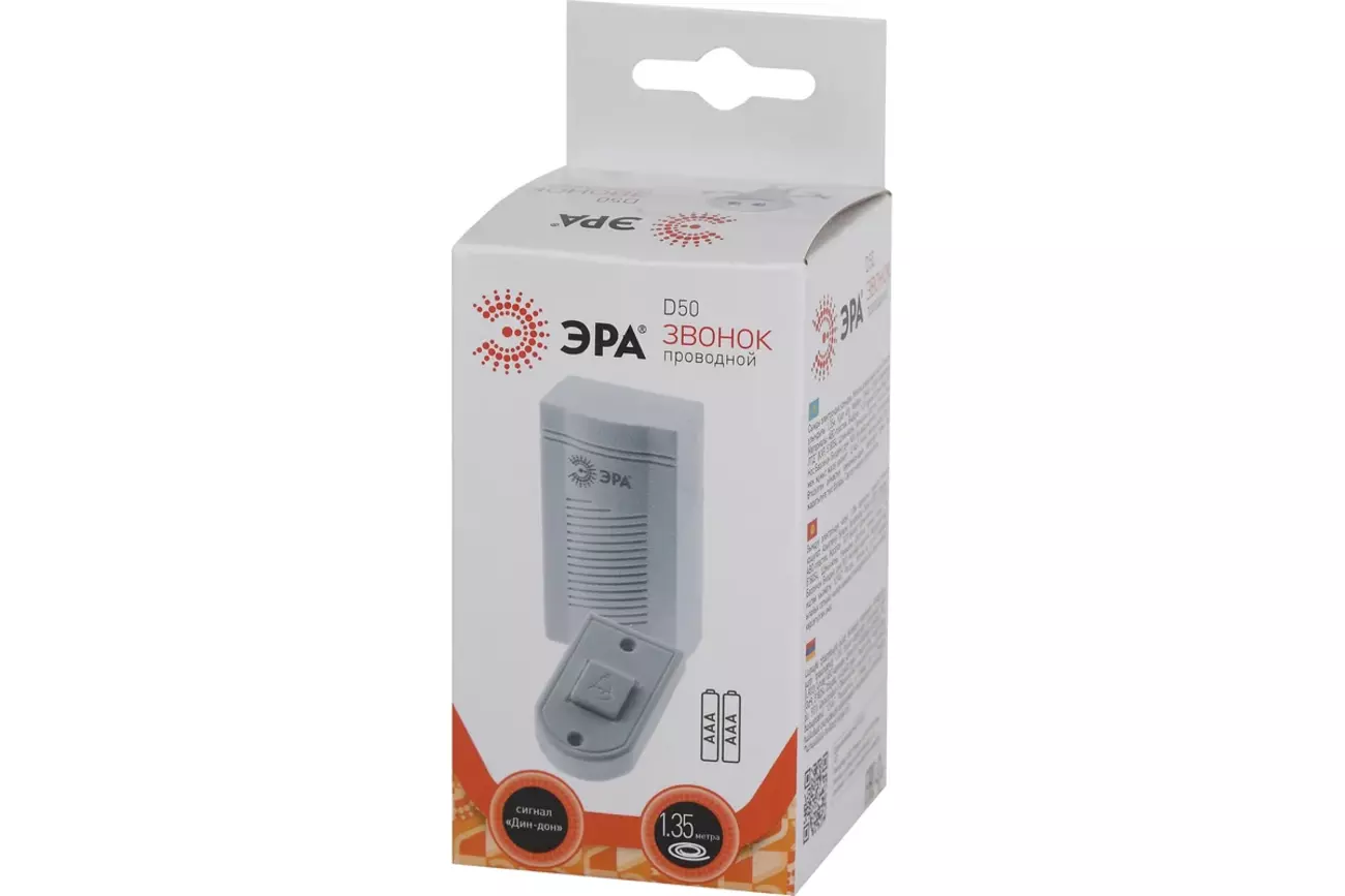 Проводной электрозвонок с полифонической мелодией. Динамик работает от 2 мизинчиковых батареек (2 х ААА) и отличается оптимальной громкостью. Длина провода, соединяющего кнопку и динамик - 1,35 м. Корпус изготовлен из легкого прочного пластика базового белого цвета. Электрозвонок ЭРА универсален для любого интерьера. Прост в установке и удобен в использовании.