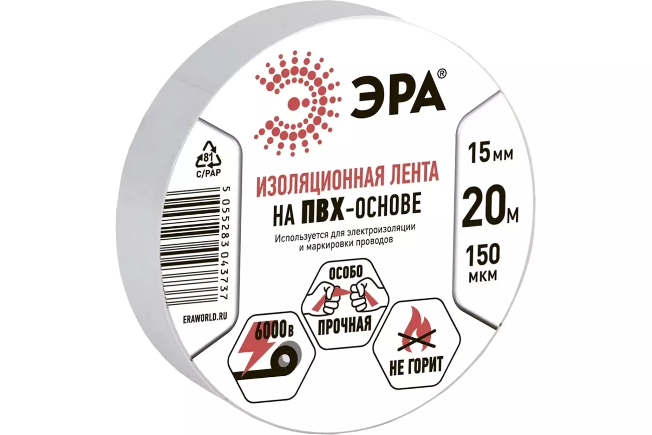 Изолента ЭРА ПВХ 15/20 белая 0.15х15 мм, 20 м