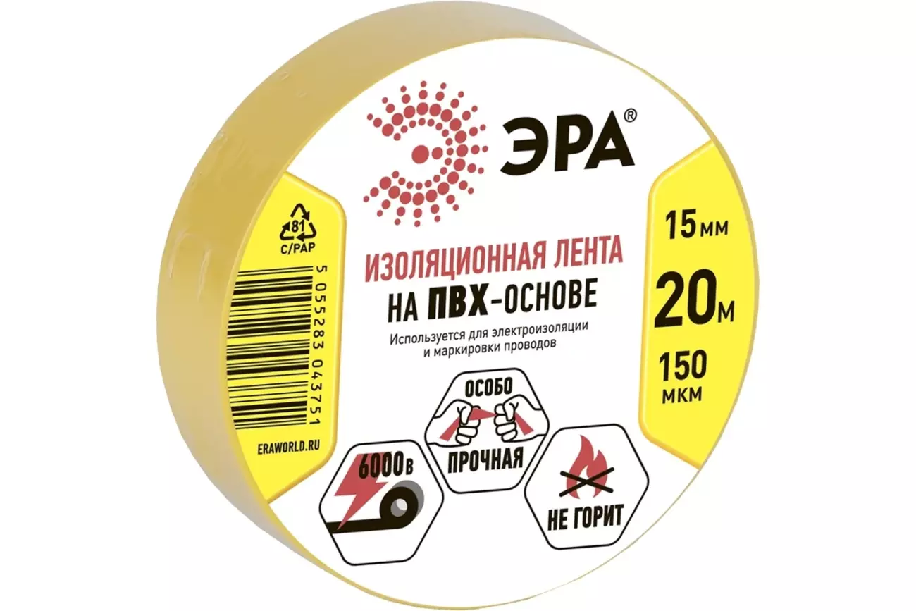 Изолента ЭРА ПВХ 15/20 желтая 0.15х15 мм, 20 м