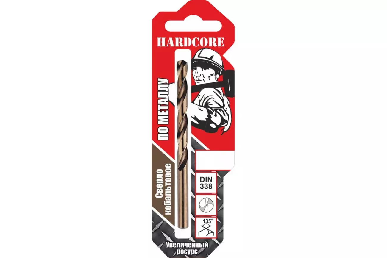 Сверло кобальтовое Hardcore предназначено для дрелей. Используется для сверления отверстий в металле. Оснастка изготовлена из высококачественной быстрорежущей стали легированной кобальтом Р6М5К5/М35 (6% вольфрама, 5% молибдена, 5% кобальта), что обеспечивает высокую жаропрочность сверла и позволяет проводить работы повышенной сложности без охлаждения. Наконечник сверла имеет заточку Split Point с углом равным 135 градусов, такая заточка позволяет сверлить детали без накернивания и легко засверливаться на сферических поверхностях, за счет чего экономится время и затраты на дополнительную оснастку.