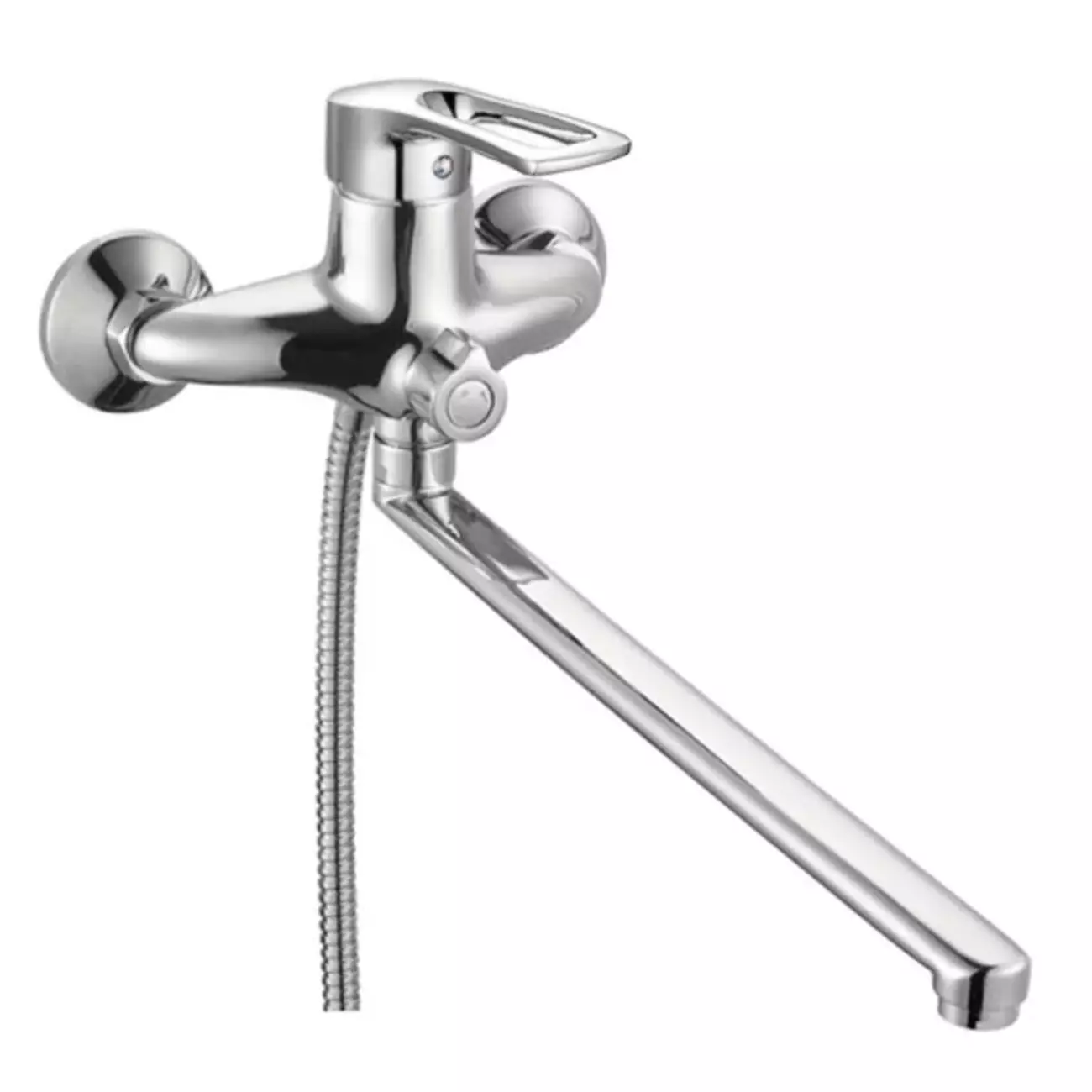 Смеситель для ванны с поворотным изливом имеет заменяемый запорный элемент - картридж с керамическими пластинами диаметром 40 мм. Устанавливается на трубы холодной и горячей воды, вмонтированные в стену. Закрепляется с помощью эксцентриков, которые идут в комплекте вместе с резиновыми прокладками, декоративными чашками, шлангом, лейкой и кронштейном. Материал корпуса - стойкий к коррозии силумин (сплав алюминия с кремнием). Поверхность имеет приятный стальной оттенок благодаря хромированному покрытию.
