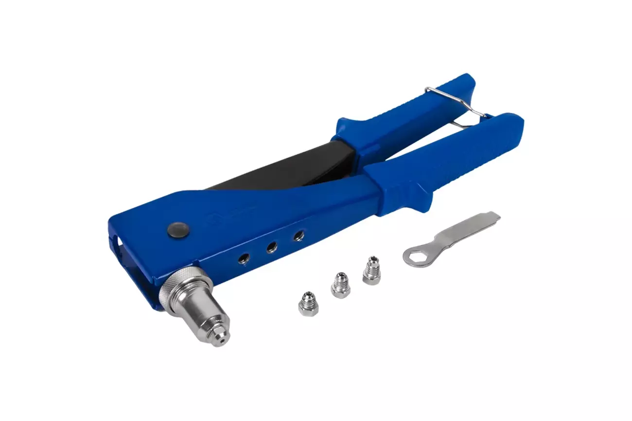 Заклепочник имеет алюминиевый литой корпус и прорезиненные рукоятки. Переставная головка на 90° облегчает работу в труднодоступных местах. Заклепочник служит для клепания листовых материалов при помощи вытяжных заклепок из алюминия.
