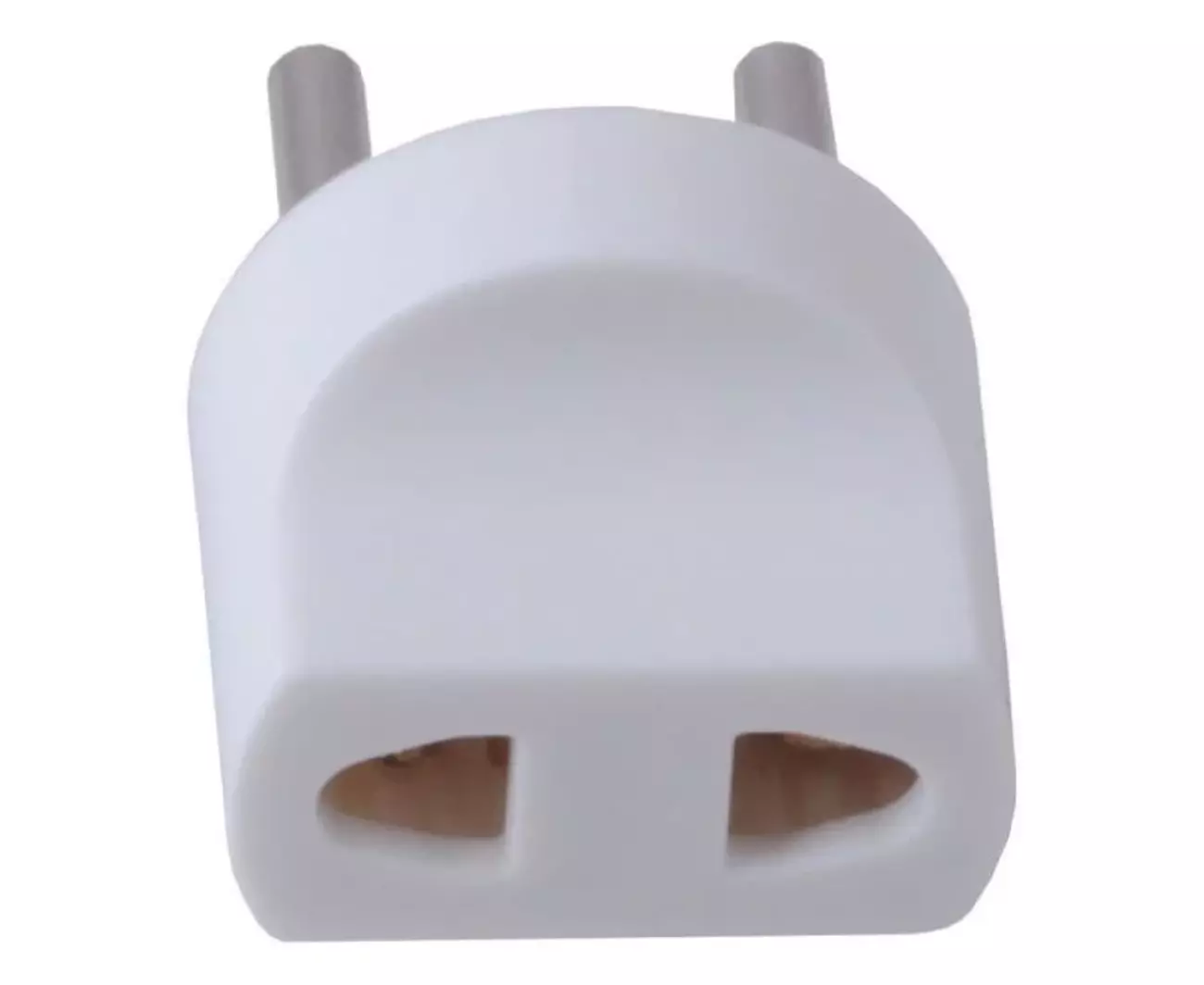 Компактный и надёжный переходник предназначен для подключения электроприборов с плоской евро-вилкой (без заземления) в стандартные российские розетки старого образца (советского типа с круглыми отверстиями).